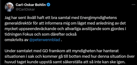 Translation: I have late this evening had a good conversation with the Director General of the Swedish Energy Agency to get information about the really sensational and serious disclosure made in the magazine Fokus and thereafter been mentioned by Peter Wennblad (in the the editorial column of one of Sweden’s largest daily magazines Svenska Daglandet).